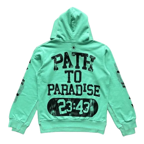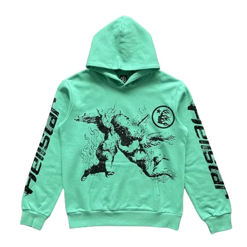 The Hellstar Path To Paradise Hoodie in Green embodies a mythic clash of creatures and modern streetwear flair. Crafted from a premium mid-weight 350 GSM cotton blend, this garment-dyed hoodie features a bold front graphic of battling beasts rendered in distressed black ink. Signature circular Hellstar emblem on the chest, βPath To Paradiseβ type across the back, and repeating spine-print logo down both sleeves add layered branding details. Finished with a roomy kangaroo pocket, adjustable drawcord hood, and ribbed cuffs & hem, itβs a statement piece that marries fantasy art with everyday comfort.