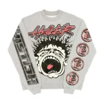 The Hellstar Records Crewneck in Heather Grey combines vintage-inspired graphics with modern streetwear comfort. Cut from a soft, mid-weight cotton-poly blend fleece, this sweatshirt is garment-dyed for a lived-in heathered finish. Bold βHellstarβ script and a screaming sunburst skull graphic dominate the front, while alternating circular record emblems run down the right sleeve and a tonal Hellstar logo graces the left arm. Finished with a classic crewneck ribbing at collar, cuffs, and hem, itβs an art-forward essential for every season.