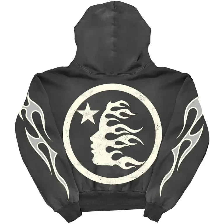 The Hellstar Sport Hoodie ‘Black’ brings street-style edge to your everyday wardrobe. Made from a mid-weight 350 GSM black cotton–poly fleece, this pullover hoodie features an oversized fit with drop-shoulder seams, a spacious kangaroo pocket, and ribbed cuffs & hem for comfort. A bold distressed-white Hellstar “X” logo spans the chest, while matching tribal flame motifs trace the sleeves—making it both cozy and fiercely graphic-driven.